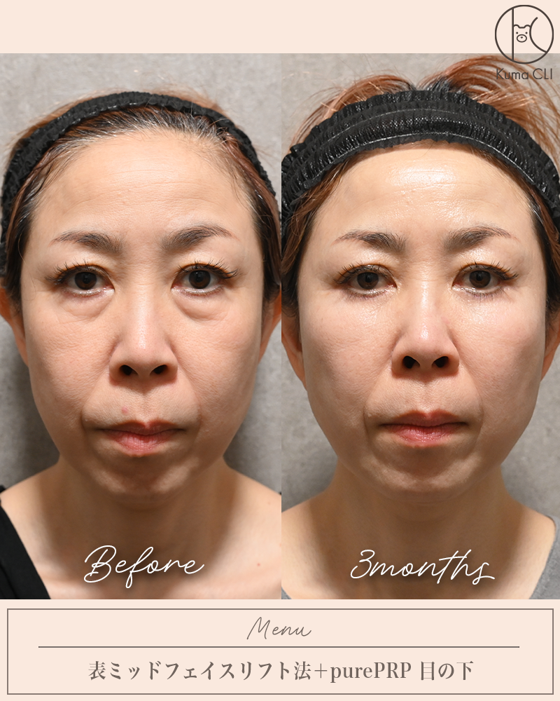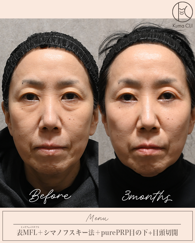 その他ミッドフェイスリフト、脂肪注入、PRP、コラーゲンブースター系の注射などを駆使することで効果の最大化・再発予防・安全性の3つを軸とした、その方にあったカスタマイズな提案をする事が可能です。